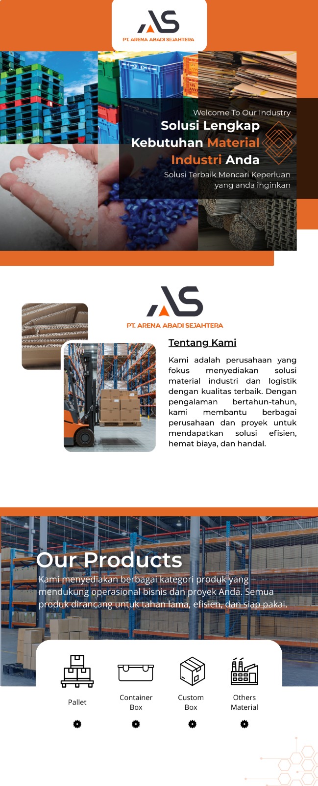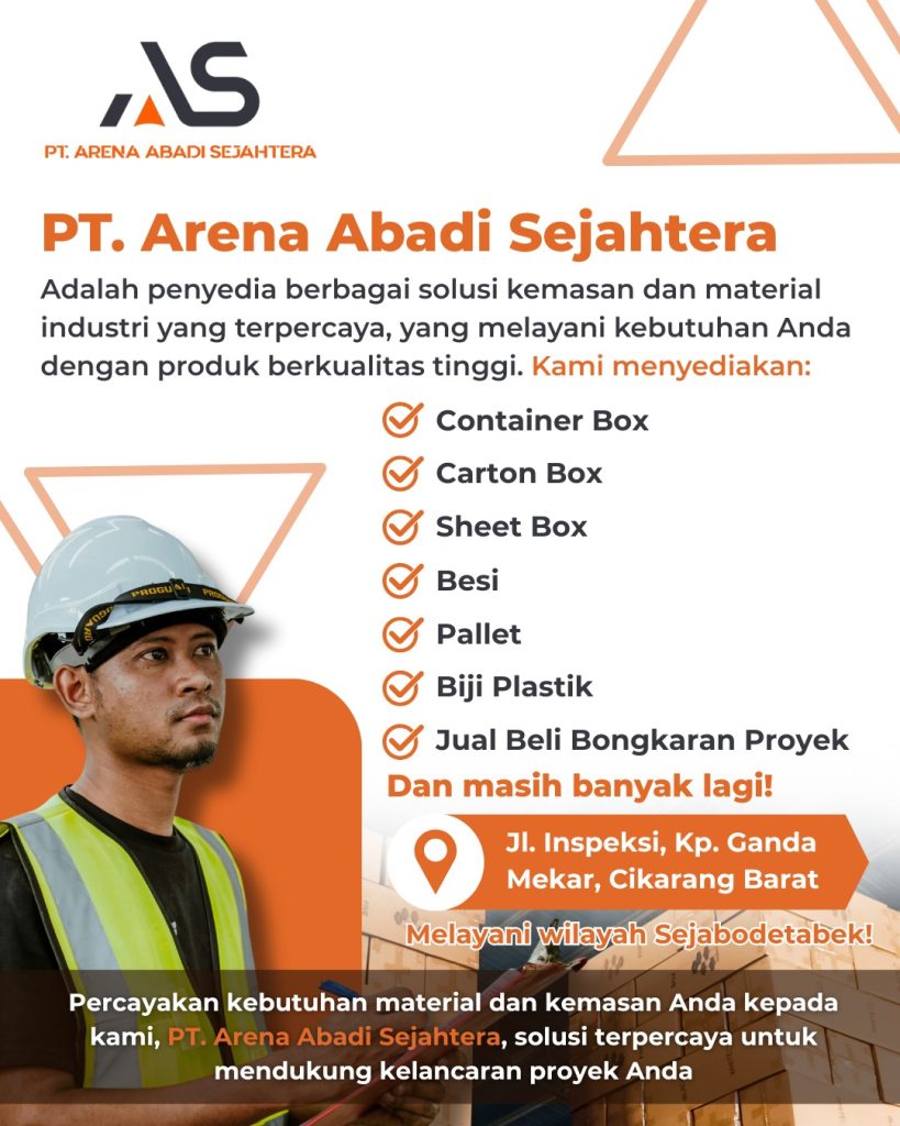 Sebagai perusahaan terpercaya dan berpengalaman, PT Arena Abadi Sejahtera berkomitmen menyediakan solusi material industri yang berkualitas unggul, tepat waktu, dan sesuai standar. Dengan jaringan pemasok luas, proses kerja profesional, serta tim yang kompeten, kami hadir untuk memenuhi kebutuhan pelanggan dari berbagai sektor mulai dari manufaktur, logistik, konstruksi, hingga proyek skala besar.